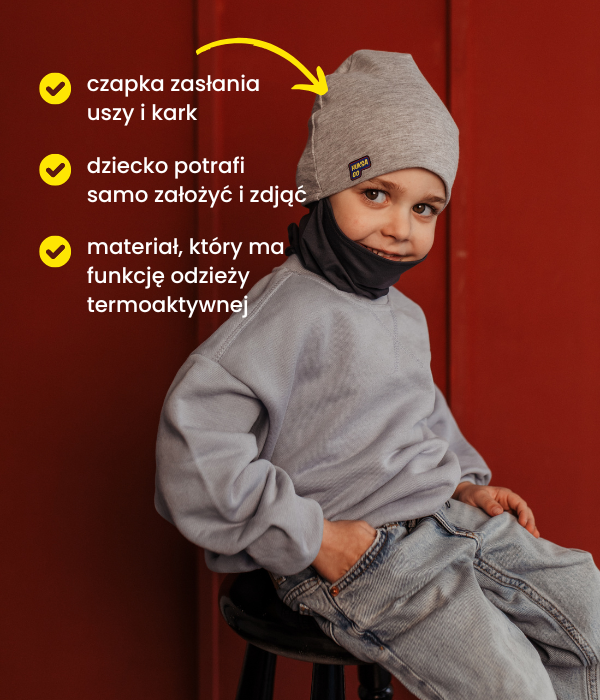 Czapki z doszytym na stałe kominem, które dzieci zakładają same. I które zostają na miejscu!